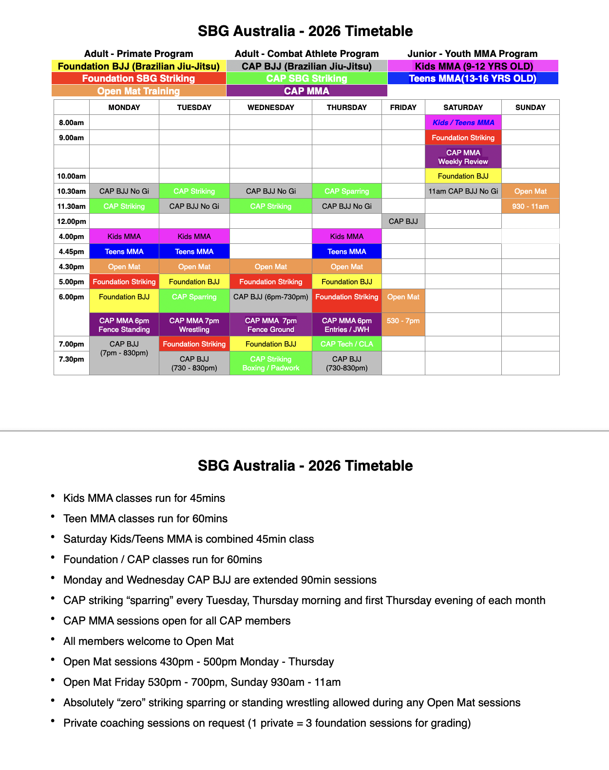 For more detailed information about the above timetable and the best program for you to get started on your mixed martial arts journey please click the free trial button at the top right of this page.